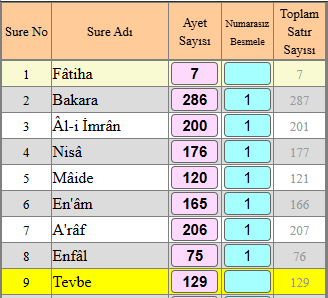(Besmeleleri + ayet sayıları) satır/dize sayılarının doğal ardışık dizilimi